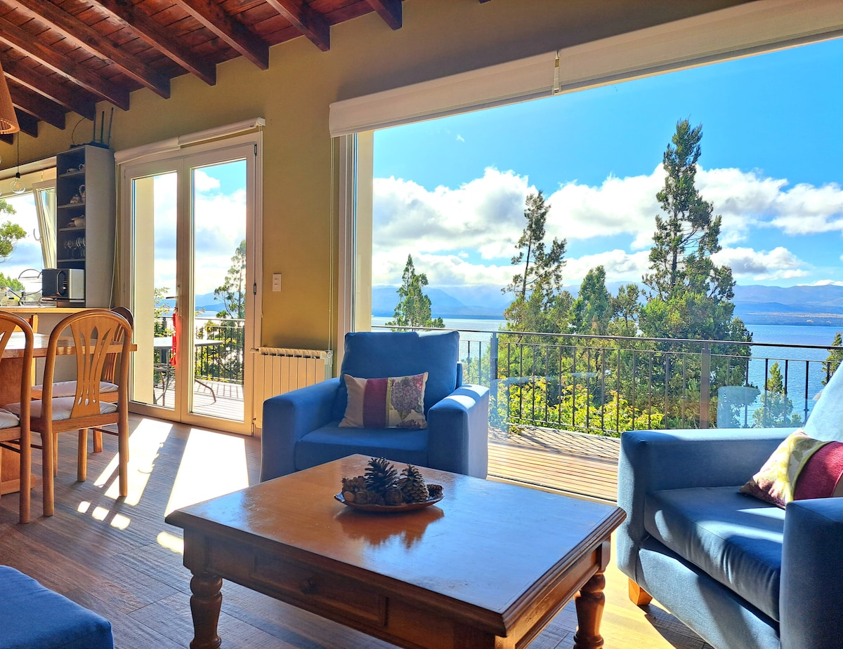 A warm, rustic-style cabin on the shores of Lake Nahuel Huapi with a hot tub, wood-burning fireplace, and deck. A studio created for relaxation and romance with a view of the sunrise and moonrise over the lake. Smart TV and FIBER OPTIC internet with WiFi for working. A kitchenette with everything you need, including a Dolce Gusto coffee maker. A safe to protect your notebooks when going for a walk. Full bathroom. Pool, ping-pong. Beach: Kayak and standup paddle. Continental breakfast.