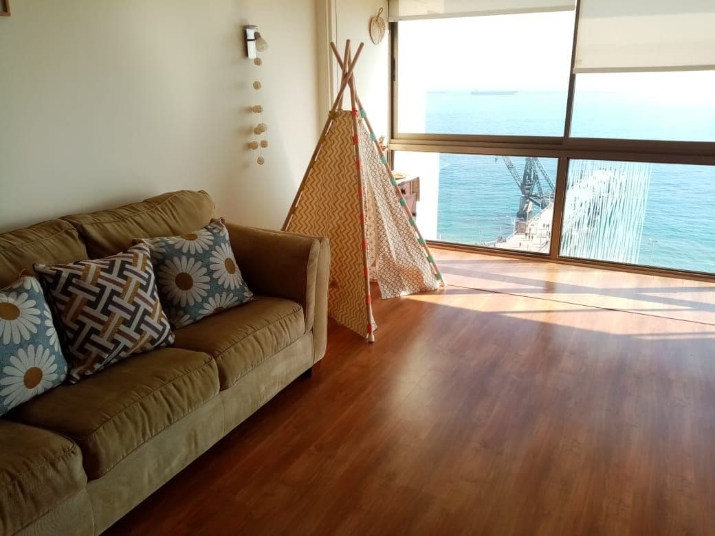 [Discounted price for lunch! Ready to enjoy] Incredible apartment for 4 people with an amazing sea view. 2 bedrooms and 1 bathroom. Main suit with a twin size bed, another with bunk bed and a sofa bed for one extra people. Sheets available. TV (with Netflix) and desk to WFH in an amazing spot and high speed WiFi connection. Located near shopping mall Marina Arauco, supermarket Lider/Wallmart and minutes away to Las Salinas beach. Includes 1 parking spot