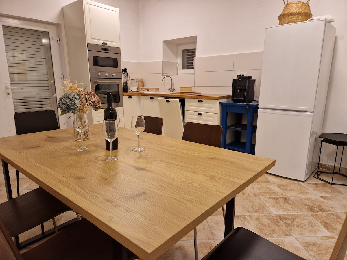 This stone villa was built in 1893. and renovated in 2021. It consists of 3 bedrooms and 3 bathrooms and it can accommodate up to 6 persons. On the groundfloor there is kitchen with a dining area. On the first floor there is spacious living room with TV, 2 bathrooms and 1 bedroom. 2 bedrooms are in the loft. There is a small gym in the groundfloor with bathroom. Outdoors you will find a covered terrace with outdoor kitchen, barbecue, dining area and a Jacuzzi in the middle of the garden.
