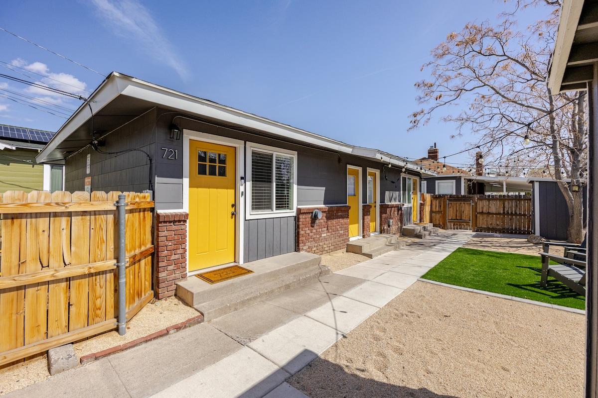 A charming 1940 brick duplex, updated for modern living in Reno's Wells Avenue district with yard, mountain views, cute garden, and off-street parking. The quaint 1bd features a queen bed, WiFi, work space, and an 80in projector with HD display and Bose speaker for a movie-like experience. We updated the entire interior - new plumbing, electrical, kitchen and bath. The result is a crisp white modern one-bedroom that provides everything you need for a relaxing holiday in the heart of Reno.