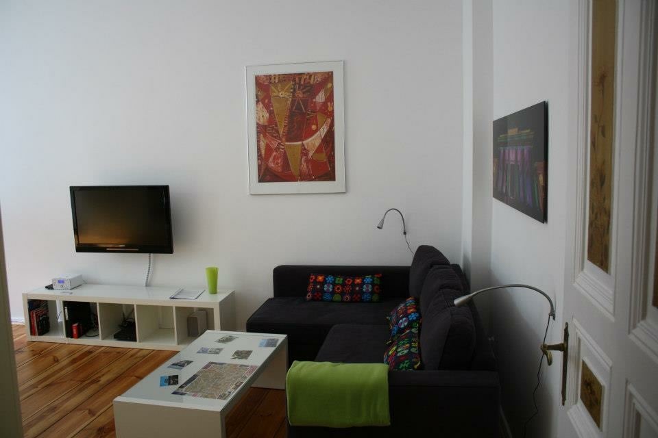 Sunny refurbished apartment in the heart of Berlin. The apartment has two rooms, including a large quiet bedroom facing the inner court yard and south facing living area with an oversized comfy sofa, dining room table and height adjustable work desk. Off the living room, lies a furnished balcony with table and chairs and lots of direct sunlight. There is a modernised bathroom with washing machine and standing shower as well as a seperate kitchen with dishwasher and full cooking facilities.