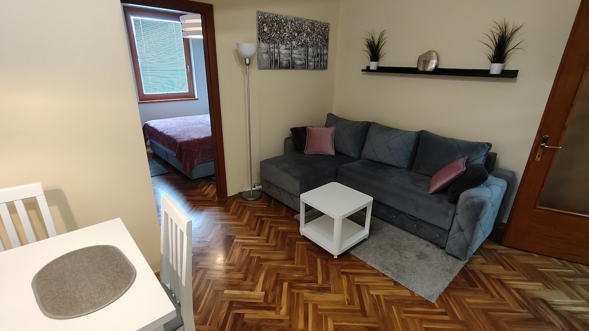 Ideal accommodation in peaceful neighbourhood near the center of the Vrnjacka Spa. Everything you need is located just a few minutes away. The apartment consists of separate bedroom with queen bed, living room with large sofa, LED TV and AC, kitchen with dishes, stove and fridge , bathroom equipped with shower with massage and FM radio function, large sunny terrace, free parking spot and free WiFi. The total area of the apartment is 40m2 and it's located on the first floor of the building.