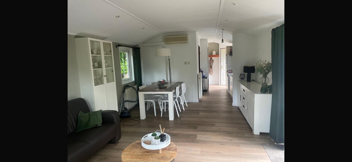 Beautiful chalet in park “de Wielerbaan” near Wageningen. Sleeps 3 comfortably. On the bike that is waiting for you, you will be on Wageningen campus in no time. On the other side is Bennekom and Ede-Wageningen station. In addition to the dining table in the cozy living room, the chalet also has an excellent workplace in the small room. Outside the chalet is a lovely covered seat, where you can enjoy the tranquility and singing of the many birds. There is a swimming pool and a cafeteria in the park.