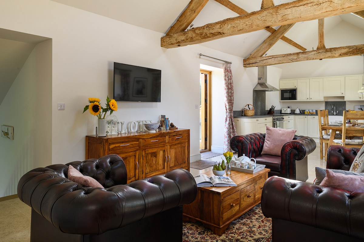 Converted 17th century barn. On the outside, the renovation is sympathetically done. On the inside, beams are retained with added comfort of under floor heating, a designer kitchen and Aga Rangemaster cooker. The principal bedroom has an en-suite shower room. There is a further family bathroom (with bath) off the hall. The second bedroom is down a short flight of stairs. The entire property is subjected to a deep clean between bookings. Outside, the property is surrounded by fields.