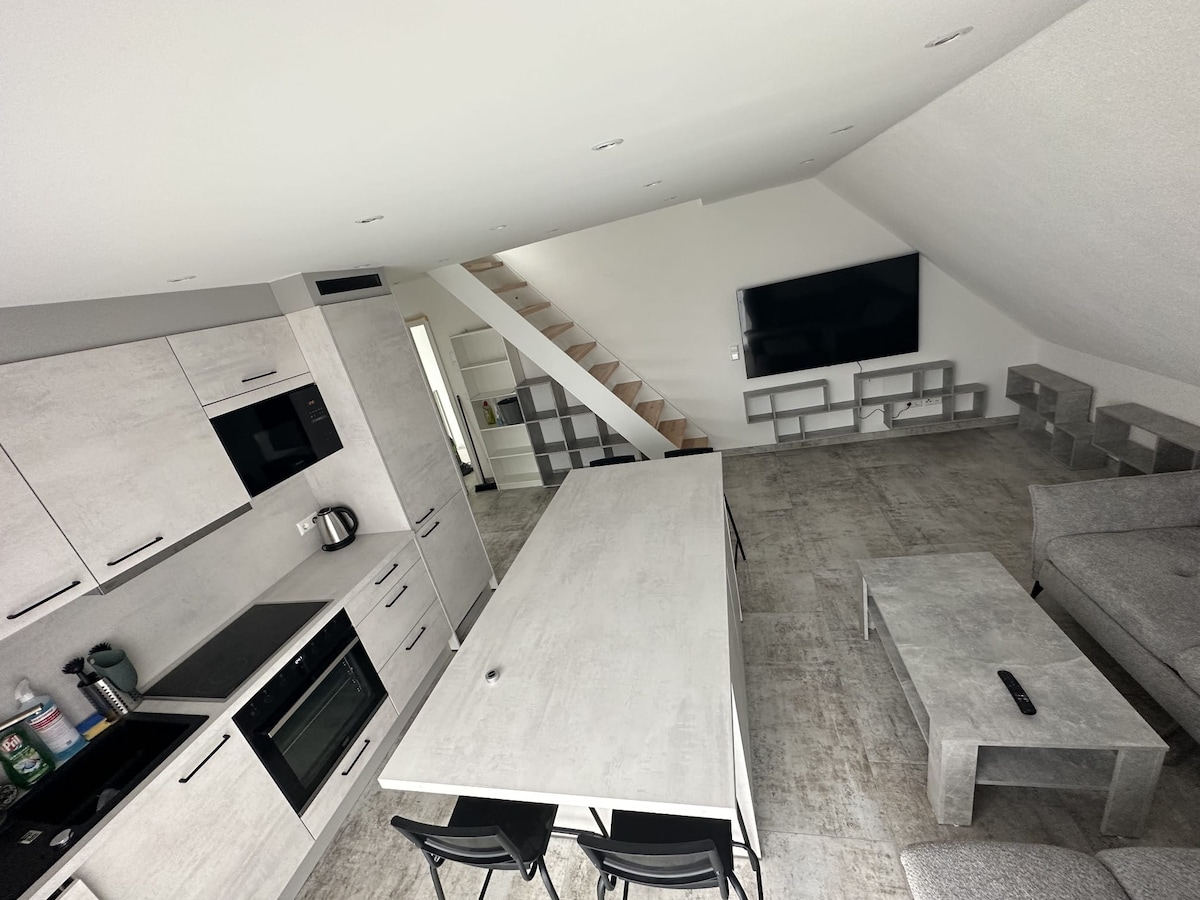 The newly renovated apartment on the top floor is quietly and centrally located in the middle of vineyards in the Weinsberg district of Gellmersbach. The bright and spacious attic apartment has a very large living room with access to a private balcony. Furthermore, a large kitchen (coffee maker, kettle, microwave) with a cozy sitting area and a bathroom with walk-in shower as well as a washing machine complete the offer.