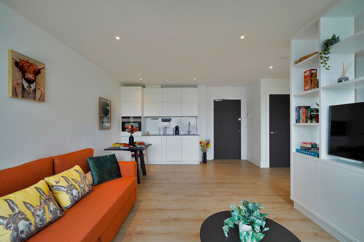 Whether you're in town for a concert, football match or just to explore the city this apartment in a secure, modern building located just 5min walk to Wembley Stadium & OVO Arena. Boxpark & London Designer Outlet nearby. Surrounded by Restaurants, Cafés, Parks, and Grocery stores. Enjoy stylish open-plan living area, private balcony, fully equipped kitchen with premium appliances and a modern bathroom. Free WiFi and Smart TV's for your entertainment. Stay active with access to an on-site gym.