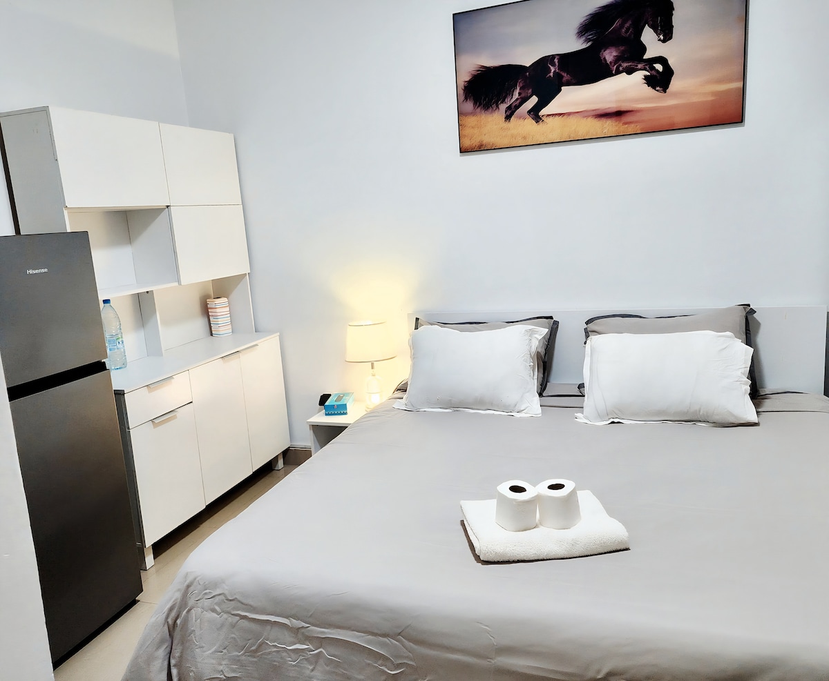 Cut out the uncertainty of not making your flight on time due to Accra’s notorious traffic, by booking this nugget 3 MINS FROM THE AIRPORT! This is a Clean, Private Bedroom with its own separate entrance and en-suite bathroom. Small yet modern & secure, overlooking serene green polo grounds, it’s so convenient for flights at odd hours & long layovers. Early & late checkouts available at a fee, and just 12 mins from town. With a gym & cool pool, you can recharge and catch your flight on time!