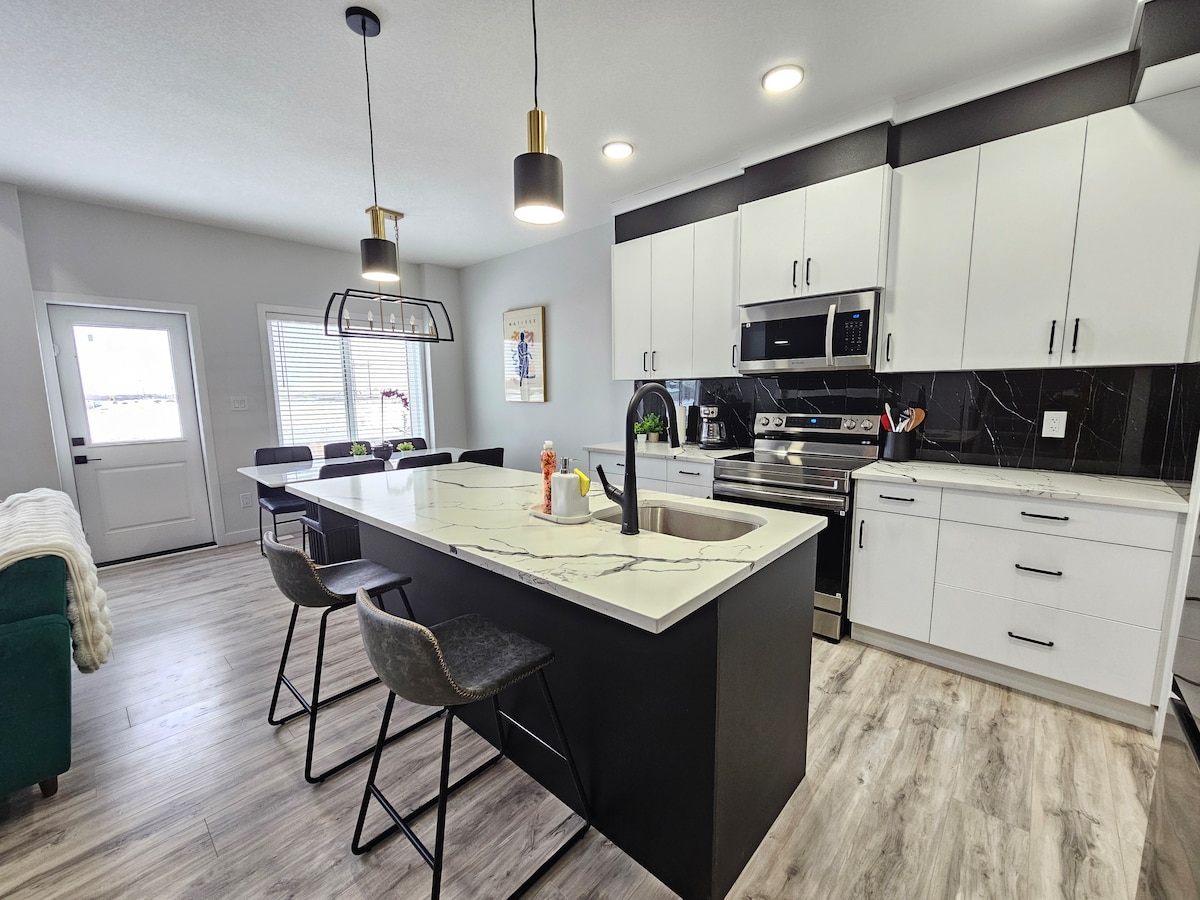 Nestled in Edmonton's delightful Keswick neighborhood, our freshly built two-story house is a blend of elegance and comfort, designed to make your stay unforgettable: Newly Constructed 2-Story Home Approximately 1400 sq. ft. Bedrooms: 3 (Master with King, 2 Rooms with Queen Beds) Bathrooms: 2.5 Air Conditioning Double Garage Entertainment: Apple TV Super-Fast WiFi Laundry Facilities On-Site Fully Equipped Kitchen 15 Minutes from Edmonton International Airport Proximity to Prime Shopping Area