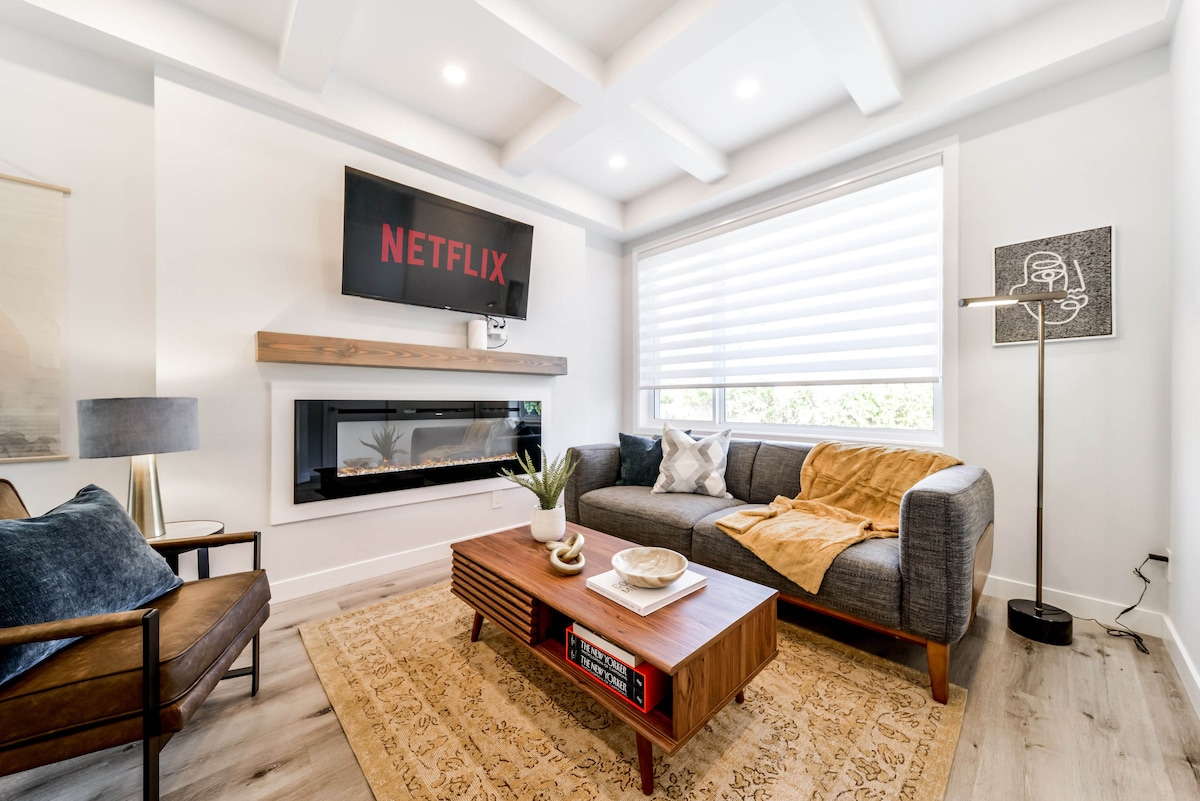 Stay downtown in a modern river valley retreat that is surrounded by natural beauty while being centrally located in Edmonton. One bedroom suite includes a kitchen, bathroom with walk-in shower and a living-room with a gas fireplace and pull out couch for additional guests. The building's main floor contains Dogpatch bistro and Bread+Butter bakery who will bring up a couple treats in the morning. Need more space? Check out River Valley Co. Suite 99 on AirBnB.