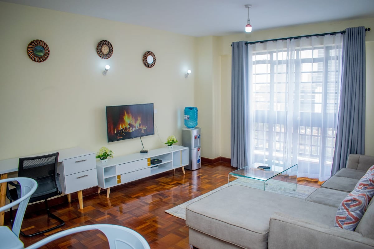 This entire stylish apartment is modern, spacious & comfortable, with one bedroom & en-suite bathroom, luxurious King size bed, eloquent dining room, bedroom & lounge Netflix-TV, balcony, kitchen and washing machine area. All amenities provided, including unlimited Fast WiFi and business facilities. Situated in a quiet leafy suburb, but also conveniently close to Westgate, Sarit and Lavington shopping malls, restaurants, business hubs, CBD and few meters walk away from Westlands nightlife.