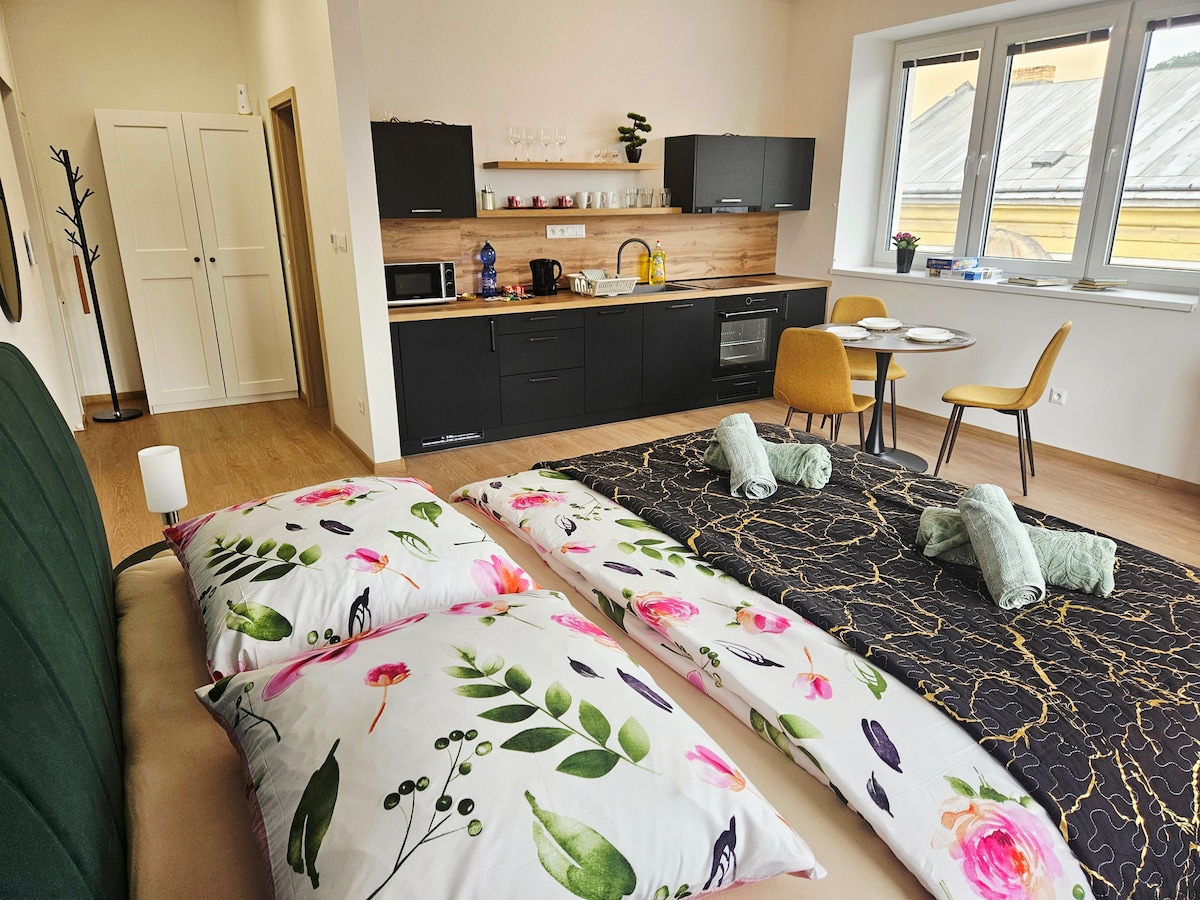Are you looking for stylish and comfortable accommodation right in the center? Our modern apartment is exactly what you need! - There is an excellent café on the ground floor of the building - Great location – you have everything at your fingertips (public transport, train and bus station, parks) - Cozy and new facility - Parking lots nearby Enjoy the atmosphere of the city with greater comfort! Perfect for couples or friends who want to explore the center and have everything close by. Book your stay today and enjoy a city-style getaway!