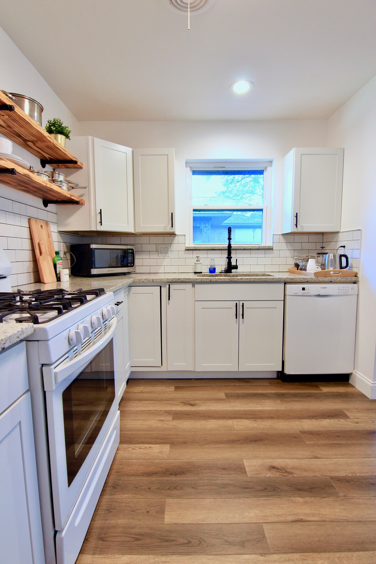 Escape to Creekside at White Rock, a stunning vacation home located in a peaceful and serene neighborhood. This beautiful mid-century 3 bedroom/2 bathroom home with 2 living spaces, gourmet kitchen, spa-like bathroom, and spacious backyard backing up to the creek. Kitchen has gas range + griddle, huge marble island with farmhouse sink, wine fridge, and more! Fully loaded coffee bar with all sorts of coffee options - Keurig, Nespresso, Grind and Brew, and French press!