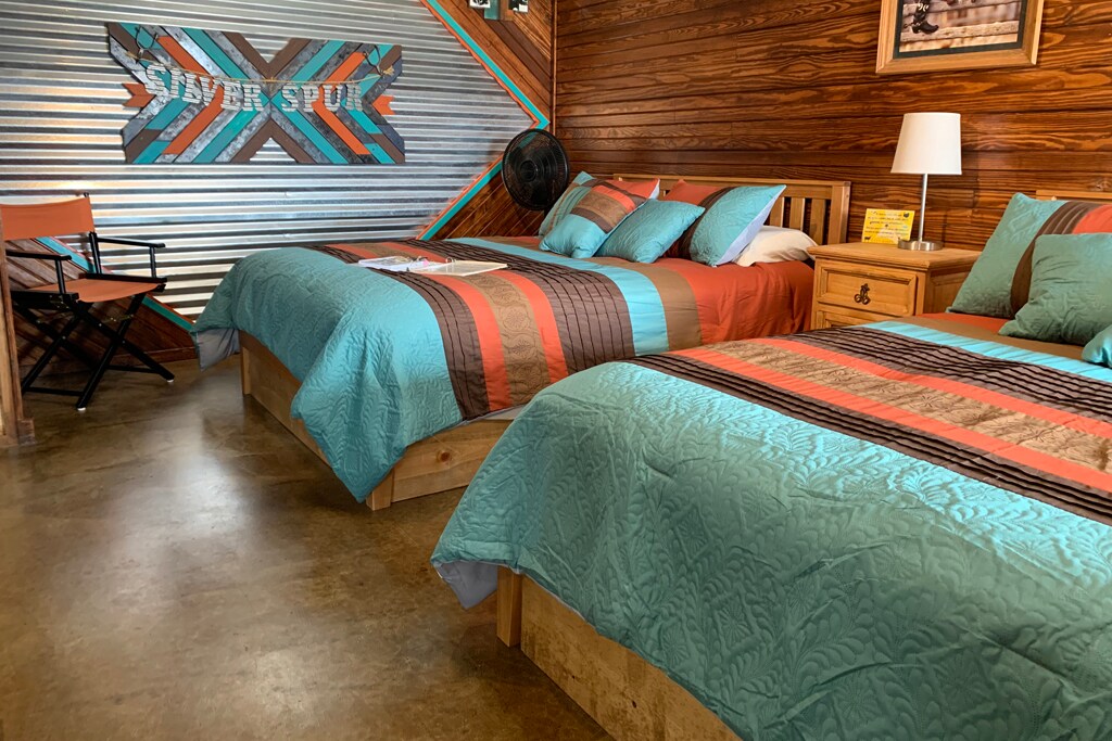 Nestled at the foothills of the Wichita Mountains, the Take a Hike Cabin at The Lazy Buffalo portrays the captivating landscape that awaits you in the Wichita Mountains where you can find 59,000 acres of mixed prairie grass, ancient mountains, lakes, streams, and miles upon miles of trails waiting to be discovered. The Lazy Buffalo has 13 themed cabins. The spacious Take a Hike Cabin is handicap accessible, sleeps 2 guests, and offers a king size bed and bathroom with a roll in tiled shower.