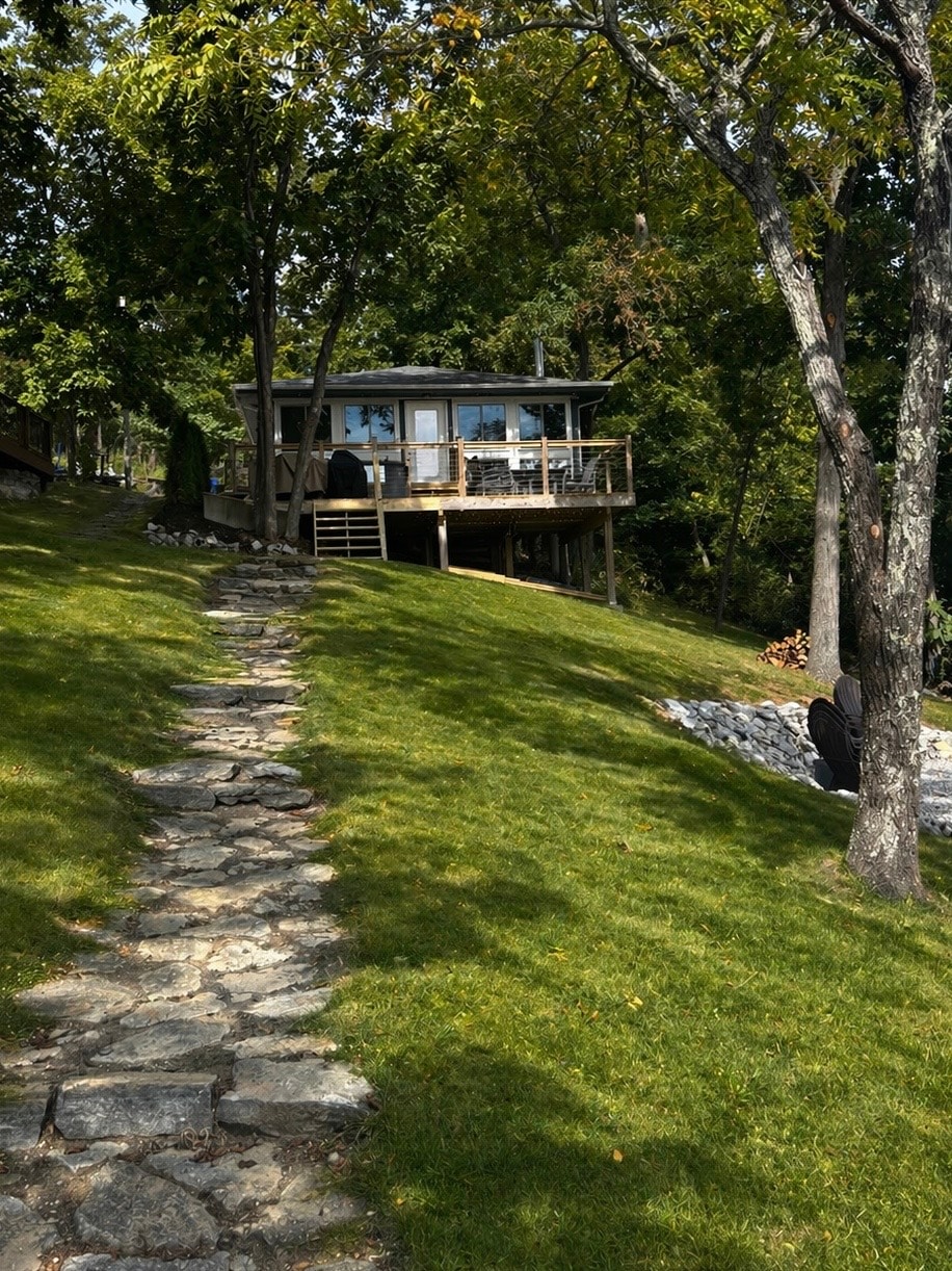 Cottage is 660 SF, 2 bedroom. One room has a queen bed. Second bedroom is a bunk bed best suited for children. The common space has a day bed with a second pull up trundle bed. Access to the owners dock and use of Kayak and paddle board when a waiver is signed. 15 Minutes to the Ark and 1 Hour to the Creation Museum & Cincinnati. Cottage attached to owners house by an outdoor breezeway and has it's own large deck and lake access. No Dishwasher or Washer/Dryer ID verify at checkin