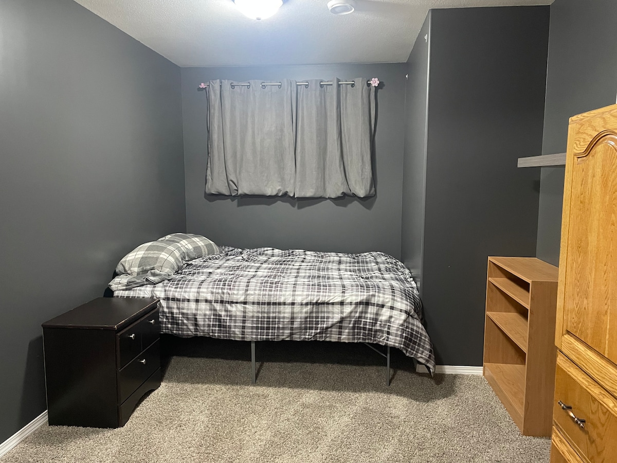 Take it easy at this unique and tranquil getaway. In a quiet neighborhood. Your own home away from home. With private deck and parking, close to all amenities: upgrader, ball diamonds, shopping, etc., this will fit perfect into your stay plans. Your private home boasts a king size bed, WIC, 3-piece bathroom, updated kitchen, living room with wifi for your electronics, DVD player, and a laundry room. Private deck and BBQ complete the package.