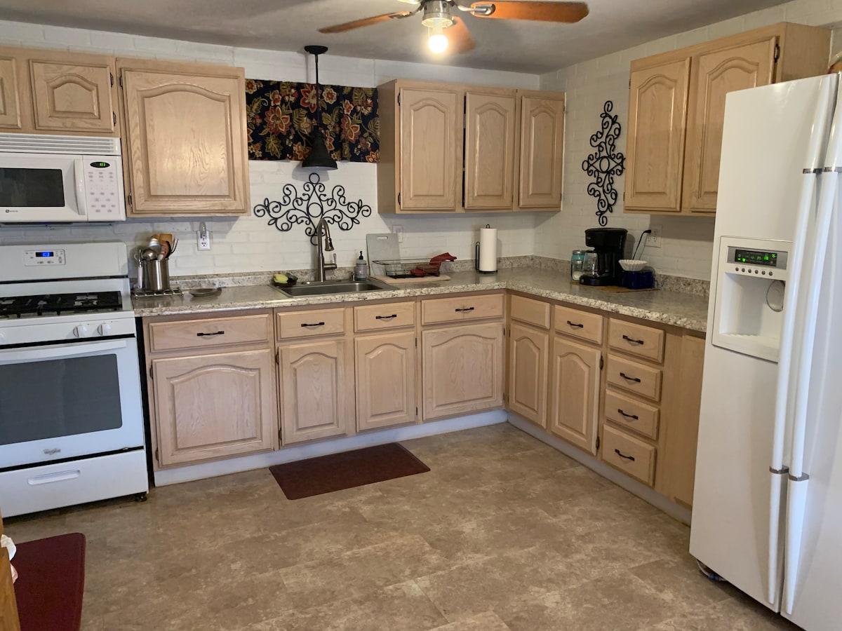 Newly renovated kitchen comes fully equipped with quartz counter tops and new stainless steel appliances. Coffee machine is kcup. Family room has smart tv for relaxation and enjoyment. Our home is pup friendly with a fully fenced yard and nice patio space. Near by Attractions -2 min drive to standing on the corner, down town, and La Posada -3 miles to Clear Creek -10 min drive Painted Desert -10 min drive Homolovi Ruins -60 min petrified Forest -45 min Flagstaff -60
