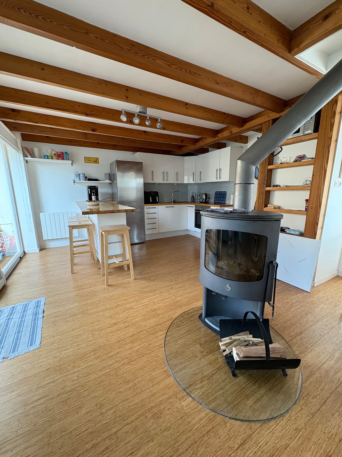 Beach House, 8 people, located on the beachfront, breathtaking view. Living room with stove, open kitchen with bar area, 2 bedrooms 160 beds + 2 bedrooms 2 80 beds, 2 bathrooms, 2 separate toilets, TV area. Wooden terrace, furniture and parasol, plancha, 4 bikes, fishing nets. Optimized Wi-Fi. Linens provided, dry cleaning included in the cleaning fee. Products for the 1st breakfast provided, wood for the stove, raclette machine, waffle maker... House, rated 4 Stars by the Tourist Office.