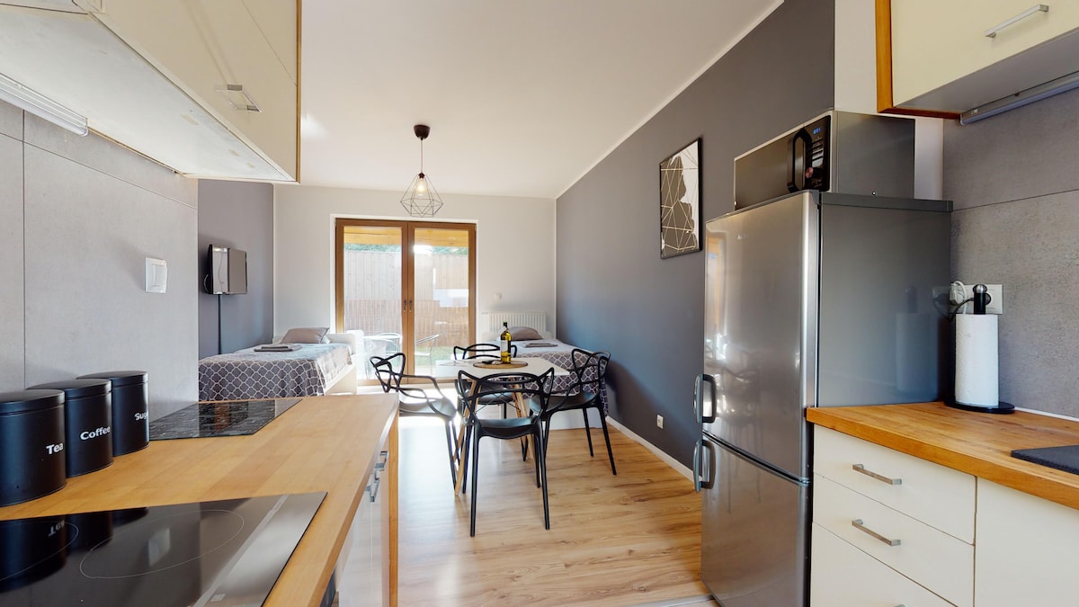 A modern, air-conditioned 70 m² apartment designed for comfort and independence. The spacious bedroom guarantees excellent rest, and the bright living room with access to the terrace is perfect for remote work and relaxation. A fully equipped kitchen, private bathroom and green surroundings of the house ensure full comfort. Excellent location close to the A4, the Iron Bike Trail and the Odra Meanders canoeing - an ideal base for active recreation.