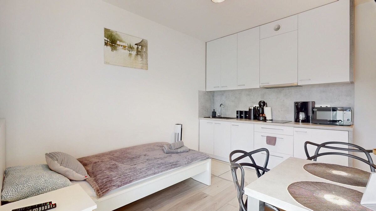 Modern and bright apartment consisting of two rooms, a kitchen and a bathroom. Fully equipped - fridge, dishwasher, washing machine, vacuum cleaner, TV, full kitchen equipment, table with 4 chairs. In the first room there is a fold-out corner sofa, in the second a large, comfortable bed. Both rooms have direct access to the balcony.