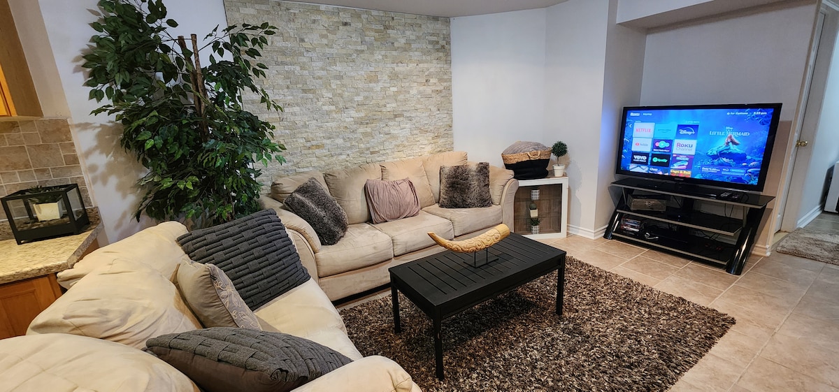 Enjoy a stylish and peaceful stay at this centrally located one-bedroom lower-level unit, perfect for both leisure and business travelers. With your private entrance, parking, and all the essentials, it’s your ideal home away from home. Features include a full kitchen, bathroom, internet, smart TV, one Queen and one sofa bed, and a functional workspace. Steps from FreshCo, Walmart, restaurants, and services. Minutes to Vaughan Mills, Canada’s Wonderland, Cortellucci Hospital and transit.