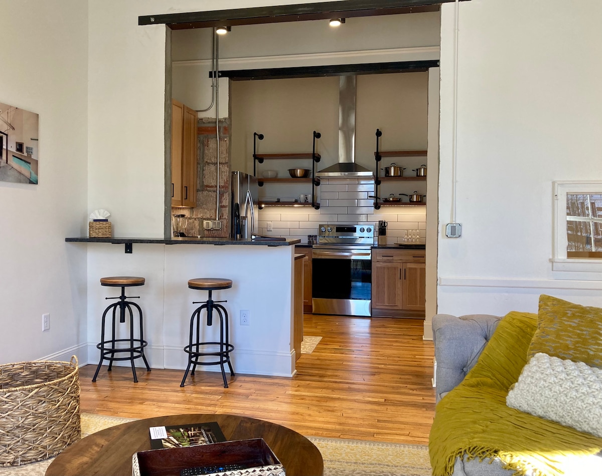 Over 1,300 square-feet and two loft bedrooms, 33 Carolina Lane – a block once dedicated to agricultural industry, today a multi-cultural gathering spot – offers modern amenities and industrial design, with just the right touch of history: Curated artwork and pops of color, designer furnishings and massive flat-screen TVs, exposed ducts and lofted ceilings – all, in perfect balance with wizened walls and striking wood floors, layered with the patina of the past.