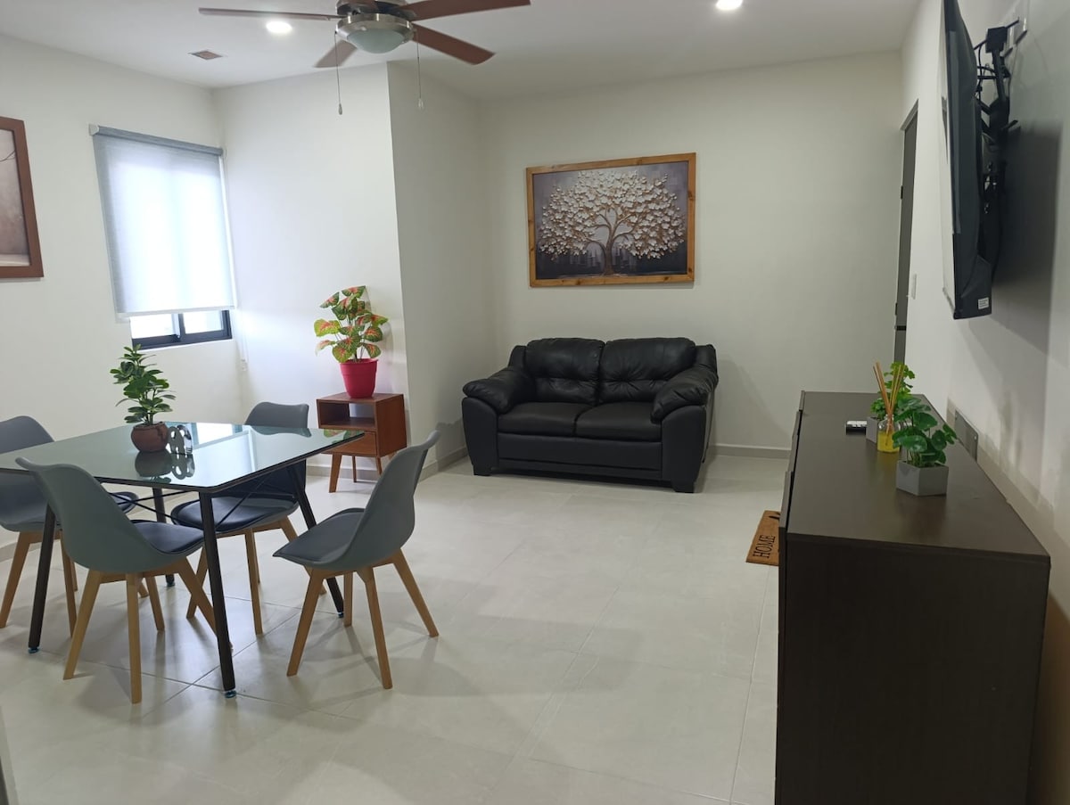 Stay in an exclusive private in the best area of Mérida just 15 minutes from the Beach 🏝️ 5 minutes from Plaza Harbor, 6 Minutes from Galleries 4 minutes from the Xcanantun Archaeological Zone. 1 min Starbucks In this your Depa 9 on Baja floor where you will enjoy our amenities: 🏊‍♀️Canal de Nado y Albercas 🎾2 Paddle courts Children's Play🛝 Area and Ludoteka 💻Coworking 🥩Żona de Asadores y Mucho más.. The Accommodation 2 Bedrooms with TV Double Beds 1 Sofa Bed, Crib 2 Bathrooms