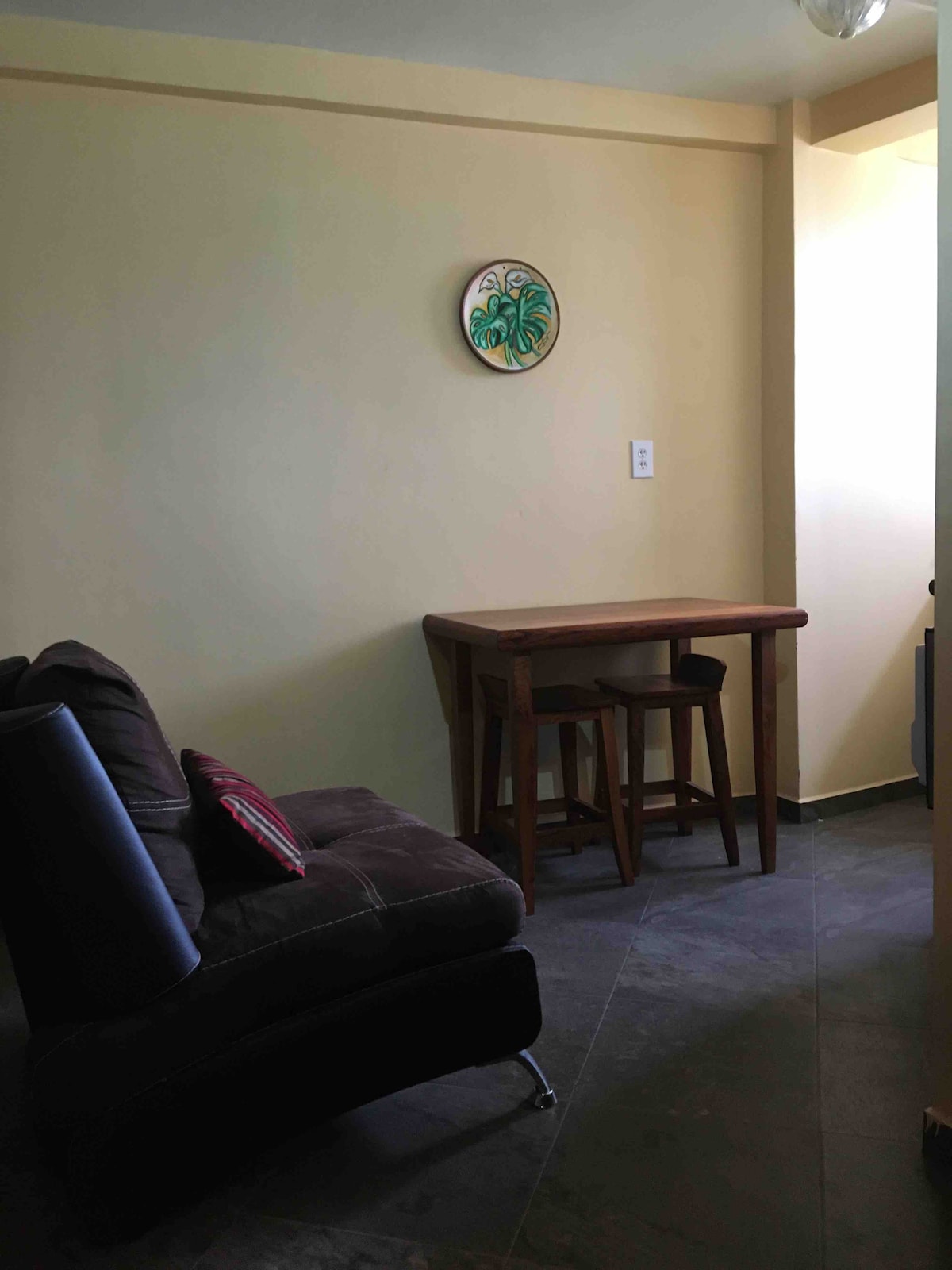 Es una estancia en planta alta con balcones en las habitaciones tiene buena vista hacia las montanas y muy buena iluminacion, las habitaciones tienen una cama king size, en total son 3 camas king size. su television, su ventilador. el departamento cuenta con su cocina integral,frigobar,parilla,cafetera,licuadora trastes para cocinar.Estamos por la carretera nacional y a 5 minutos en automóvil del jardin surrealista. **** no aceptamos mascotas.