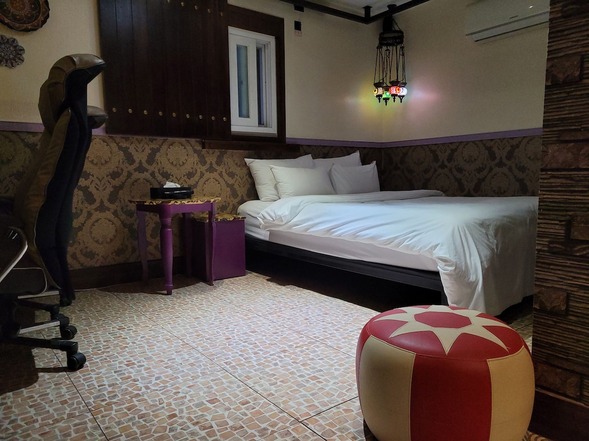 1 queen bed, 1 super single bed, 3 chairs, 3 sets of tableware [Couple/Triple] Cozy 2-beds and 3/4 bath (1 Queen bed, 1 Super single bed) Connect to Subway stn. * Government Authorized * - Super Safe Guest house โฃ Free: WiFi, YouTube, parking in the building โฃ Welcome tea provided (Nespresso capsule coffee machine), mineral water provided, blackout curtain, hand sanitizer, shampoo, conditioner, body wash, disposable scrubber, wash cloth, mood, etc. โฃ Refrigerator, drom, coffee pot, hair dryer, cleaning tools (provided upon request) Moonlight Festival โฃPark Station: 5 minutes on foot Walk โฃin Moonlight Festival Park โฃRestaurants, cafes, convenience stores, etc. โฃCooling & Heating Information 2025 April 17 Heating End / April 21 Cooling Start Please note that dates may change depending on the schedule in the future. โฃ Opening the outdoor pool (closed from 5.24 to September)