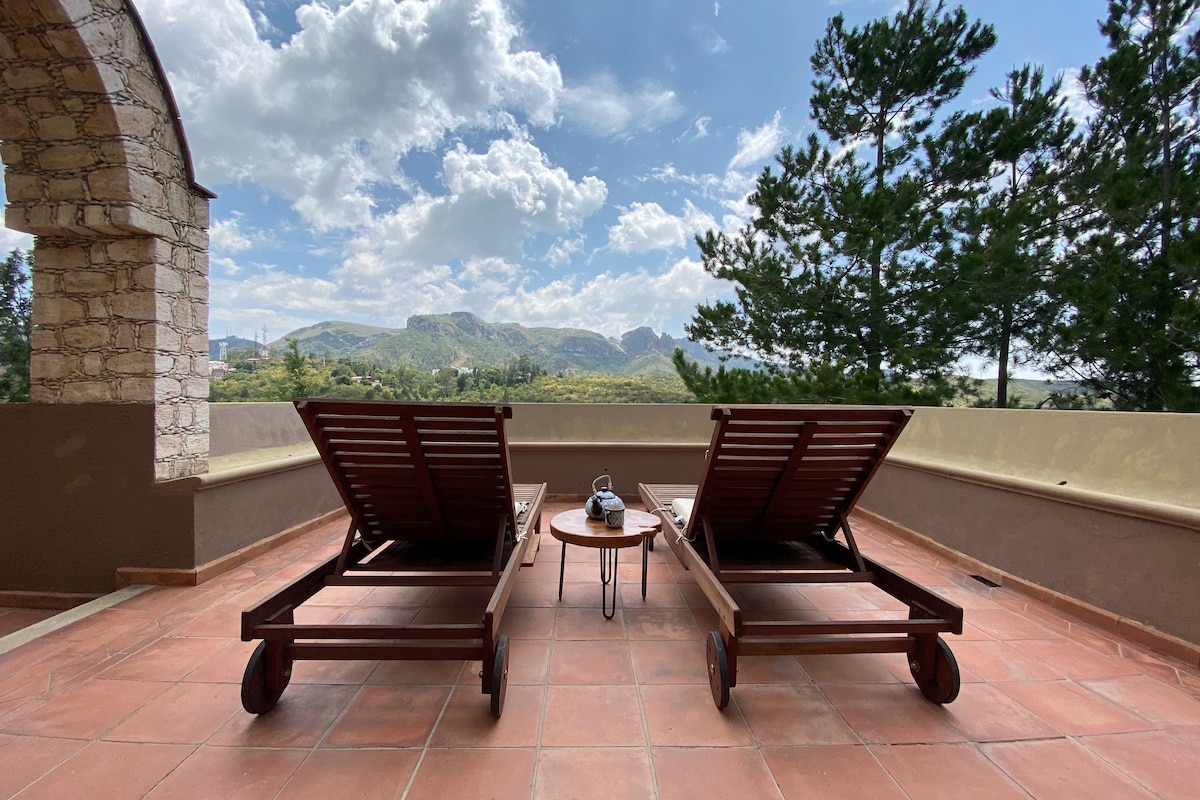 Casa localizada en un callejón peatonal del monumento al pipila. La casa tiene una de las mejores vistas de toda la ciudad lo cual la hace una estancia única. Con cama king size y un hermoso balcón con vista panorámica. La casa se encuentra en medio de un jardín frondoso que permite la privacidad en todo momento. La casa cuenta con dos salidas, a 10 minutos caminando colina abajo del centro de la ciudad y a 4 minutos colina arriba del mirador del Pipila.