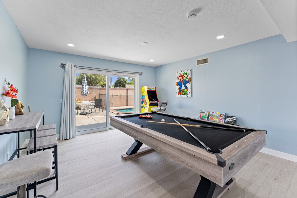 No hidden fees, No additional required tasks, more complimentary amenities for you and your family! Enjoy a truly all American home in the heart of Placentia where all the neighbors know your name. During the summer, the family can stay cool indoors with retro arcade games or a complimentary alcohol cocktail! During the winter, enjoy an evening outside on the patio with a private fireplace and three heating lamps around the outdoors dining table or take a dip in the 82 degree heated pool.