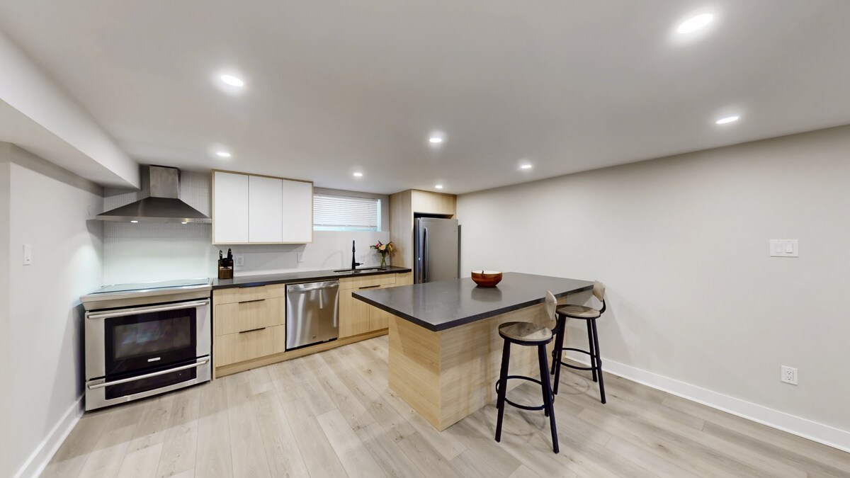 Enjoy your stay in this fully renovated, modern lower-level suite located in the heart of Central Etobicoke. Features: Private entrance Large and bright bedroom with a queen-sized bed and fresh linens, lots of closet space. Bright living area with smart TV, Sleek, fully equipped kitchen with fridge, stove, microwave, coffee maker, and essentials Contemporary bathroom + Powder Room In-suite washer and dryer Free parking and Tesla charger on-site High-speed Wi-Fi. Access to backyard/ BBQ.