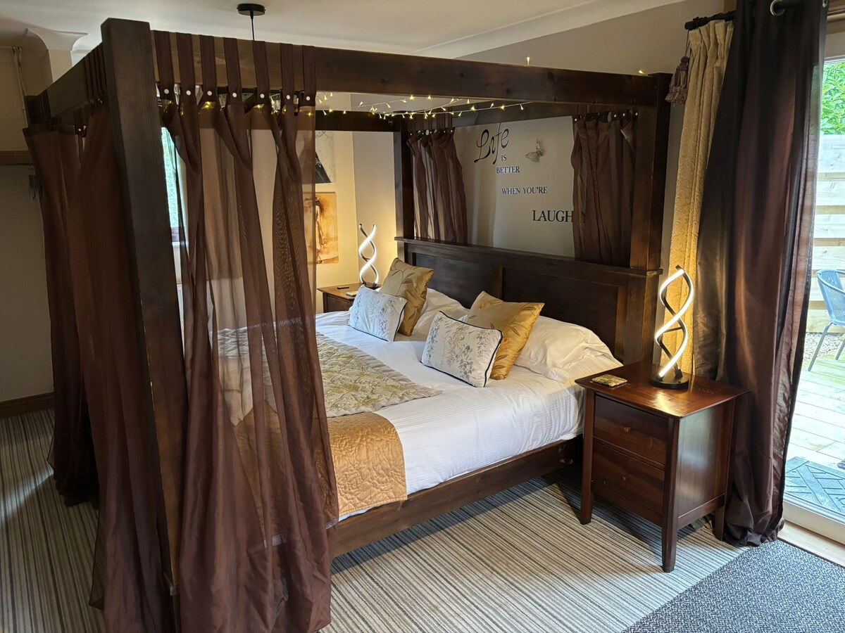 Honeysuckle Lodge is a Luxury Self Contained Air Conditioned Bijou Residence in an elevated position with Wood and River views on Waterside with Pubs & Cafes within 300 yards, The interior is dominated by a Large Glass Roof Lantern, Luxury Bathroom, The Main room has a King size bed, Small kitchenette, 55” Smart T/V, Spacious Decking area with Garden Furniture. Close to the Yorkshire Dales, with transport links to Harrogate & York, the station is 750 yds away