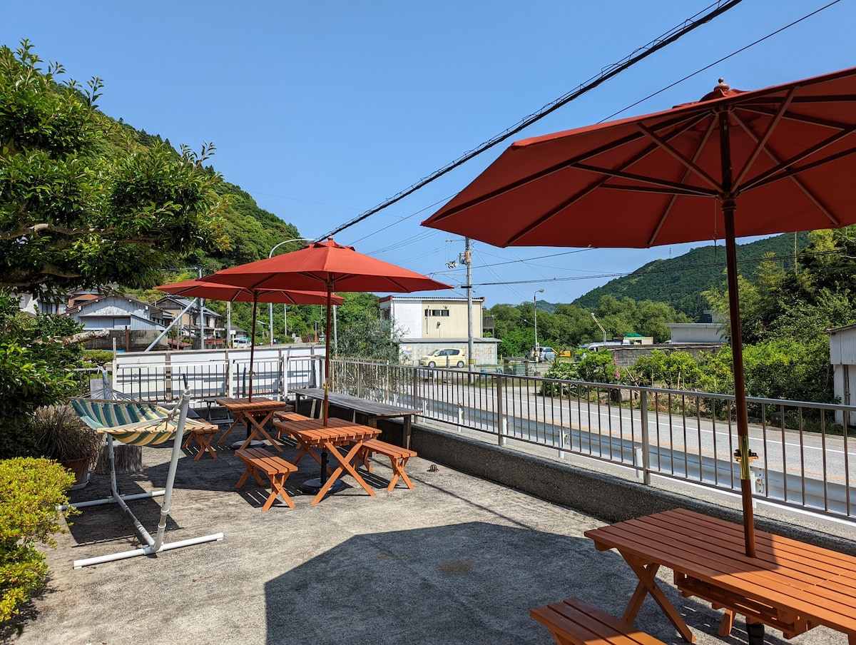 God Valley, a lodge for experiencing the● Niyodo River● This is a log house on the bank of the Niyodo River, where you can feel the warmth of the wood burning in the fireplace. It has a large garden and terrace where you can BBQ or relax in hammocks and umbrellas. The owner, who knows the area well, will provide activities such as playing in the river, canoeing, hunting, and secret river play spots, so you can have a slightly different stay. Whether you're with your family, fishing, traveling alone, or staying overnight, we can accommodate a wide range of requests. If you want to enter the hot spring, we recommend "Cloud" which is a 3-minute drive, and we also provide discount coupons for bathing. We will do our best to make your stay enjoyable, so we look forward to your reservation.