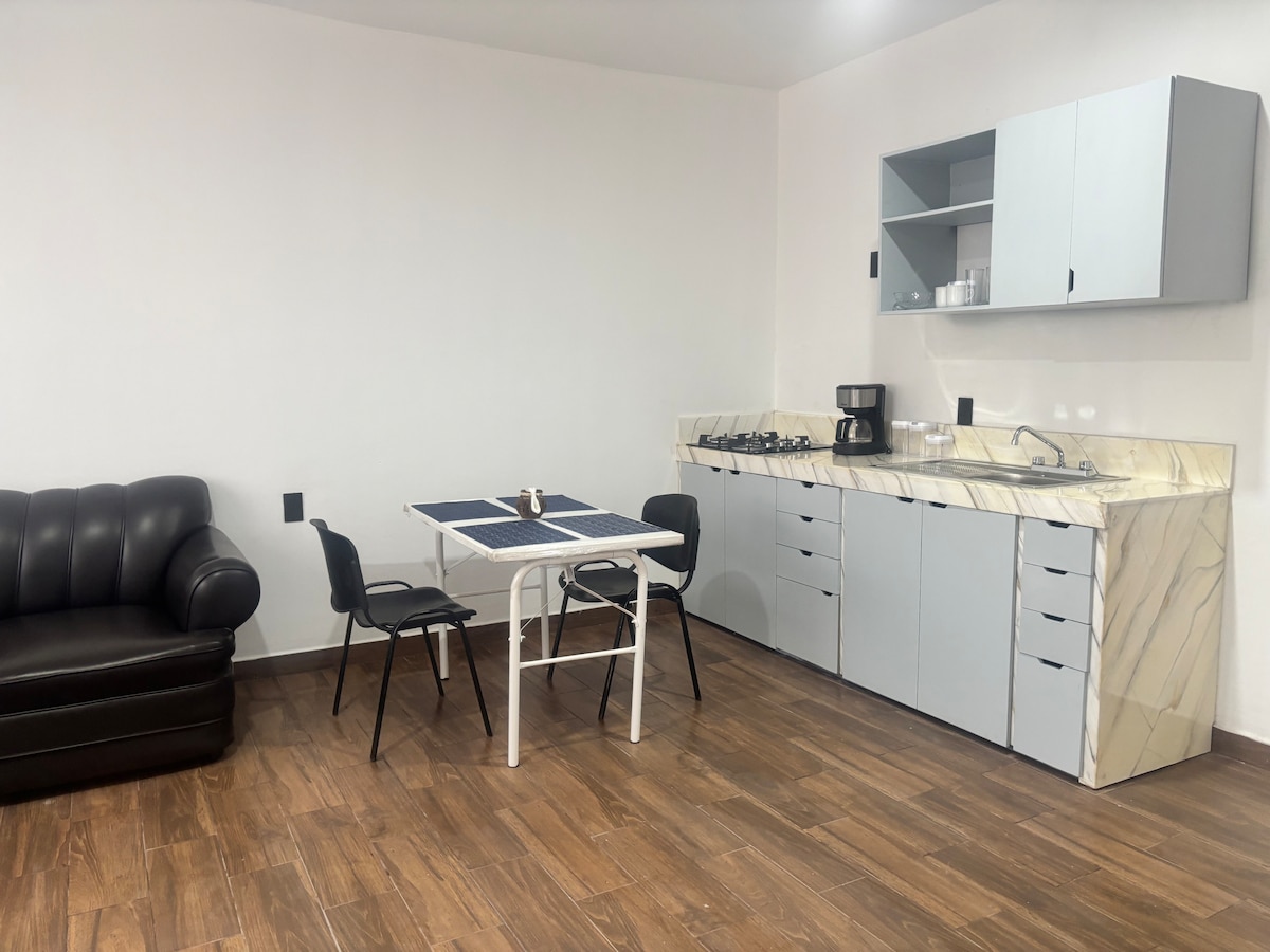 Mini apartment ideal for solo travelers or couples. Just a 3-minute drive from Oaxaca Airport, you can even walk there. Right outside you can take shared taxis that take you to downtown Oaxaca for only 12 pesos, which makes transportation much easier without the need for a car. A few steps away is the Tequio Park, ideal for those who enjoy exercising outdoors. It is a clean, functional space, perfect for a short stay or as a base to explore the city.