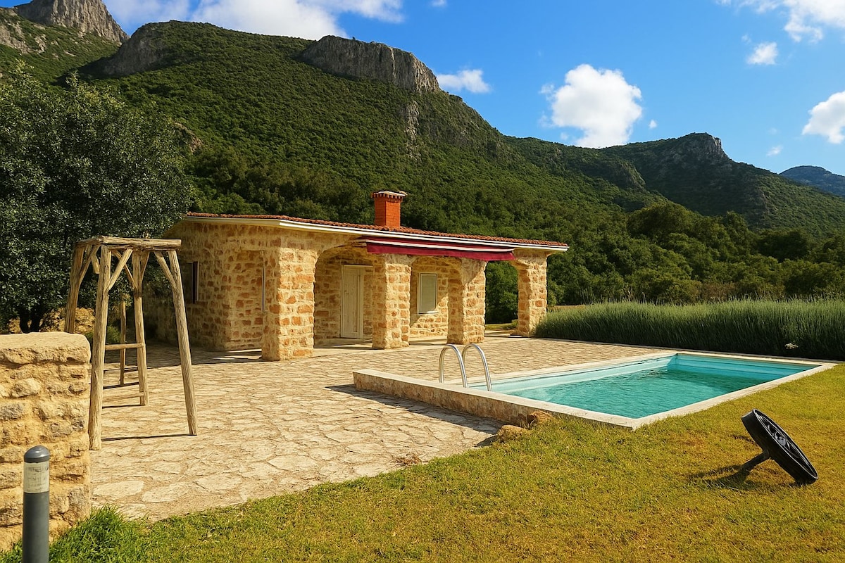 The villa is situated within a lush green landscape, featuring a modern design and a spacious outdoor terrace. An inviting pool is visible, reflecting the blue sky, while the surrounding nature complements the tranquil setting. The property is expanded by a sweeping view of the distant mountains.