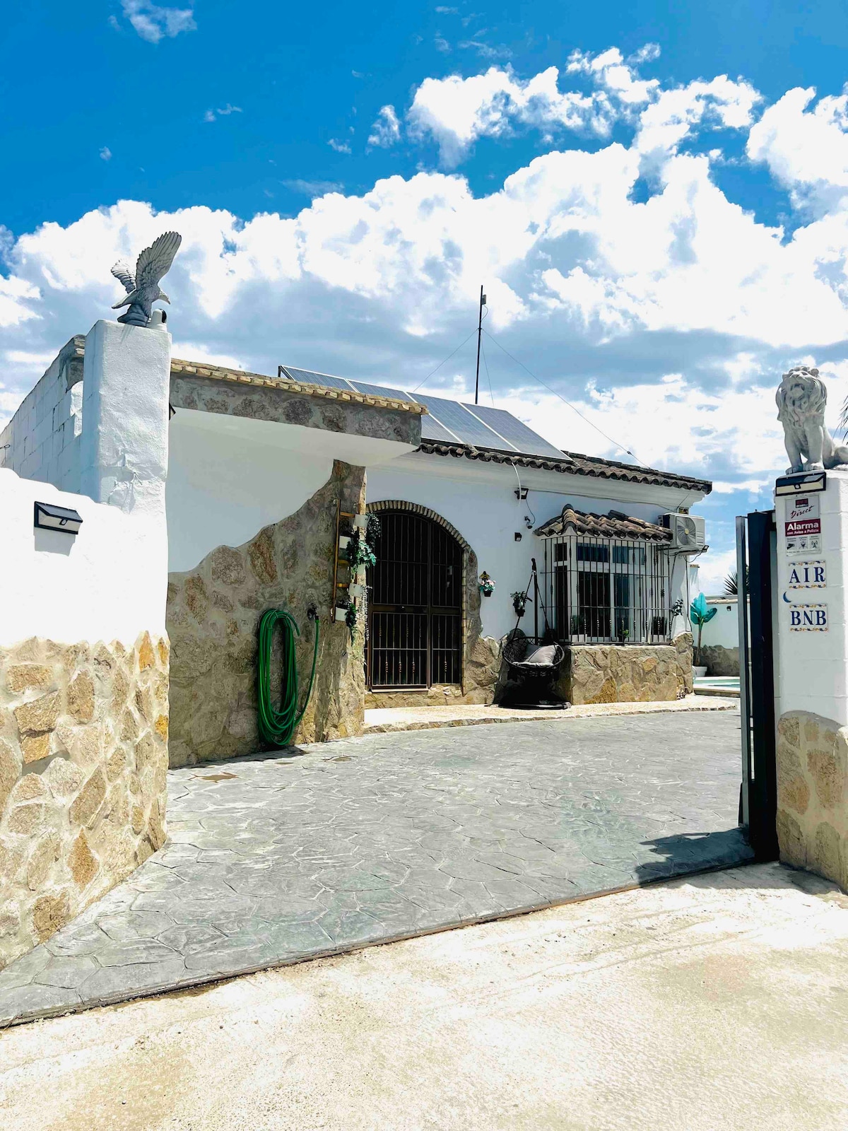 Chalet on a 500-meter plot, with the best artificial grass, distributed in a porch with access to a glazed house, living room, full kitchen, three full bathrooms, one of them outside, living room with security door to the garden, three bedrooms, the main one with an interior bathroom. Air conditioning throughout the house. In the private pool area, there is an outdoor kitchen with dining room and charcoal barbecue and gas fire, fully complete. The house has Wi-Fi, linens, and towels.