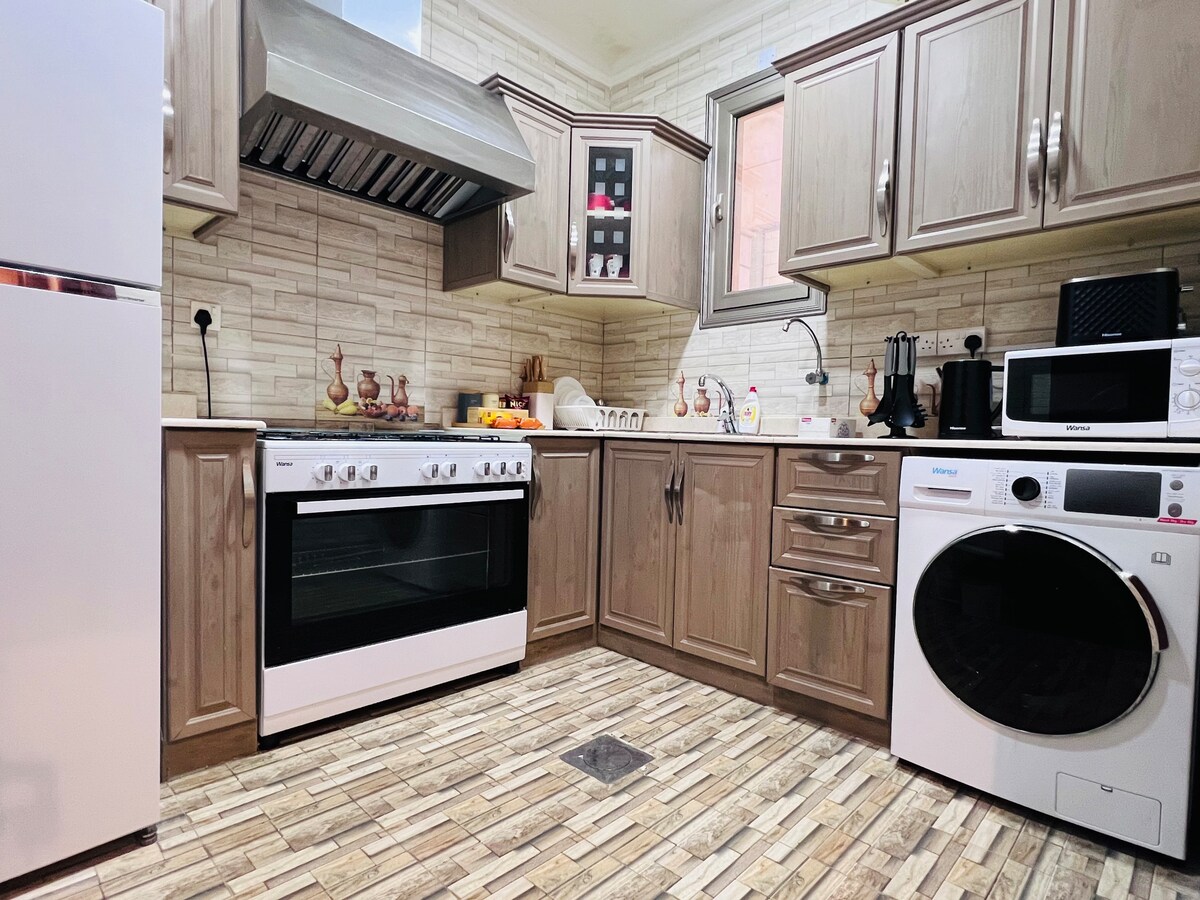The perfect blend of a simple, affordable and comfortable stay in the heart of Salmiya. *Self checkin(code provided before checkin *Apt has 2Bedroom with one being the Master with attached bathroom *Both bedroom has queen beds(160*200) perfect for 2 person. *Apt has 5G internet *70" Samsung TV in Living and 55" Wansa TV Master bedroom with Netflix, Prime Video& YouTube. * All basic Toiletry things are provided * Kitchen with basic appliances including washing machine. *Fridge with minibar