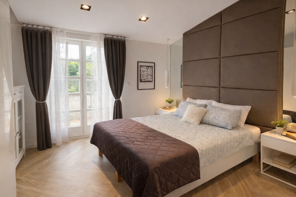 Charming studio apartment hidden in a steep, winding and picturesque cobblestone road in the peaceful part of the medieval city of Motovun. As a part of a eclectically refurbished 18th century house built on top of the second defence wall with a breathtaking view of the tranquil surroundings -vineyards and olive yards spread over the hills scattered with sleepy little villages, and overlooking rooftops of the houses in the neighborhood…