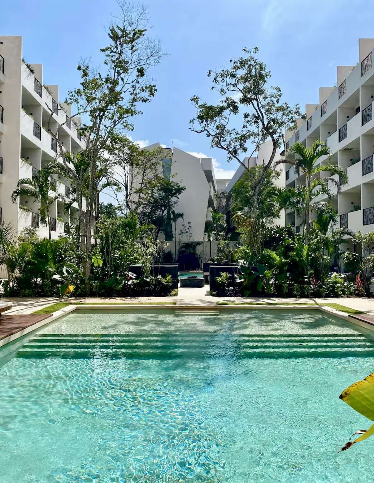 High-end resort with a private, well maintained apartment: Your private oasis with hotel amenities and personal concierge. Huge private outdoor yard, beautifully decorated interior with locally made art. Enjoy a king bed, purified drinking water, floor to ceiling glass windows, full kitchen, fold out couch, AC, Wifi, Washer/Dryer + ample closet space. Fantastic community with 2 pools, the biggest gym in Tulum, 24 hr security, on site restaurants, bakery & grocery & free shuttle to the beach!