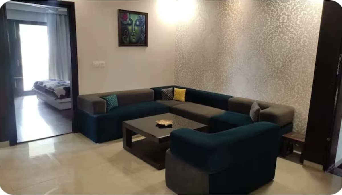 Welcome to Golden Heaven, a luxurious oasis! 🏰✨ Our stunning drawing room features rich golden wallpaper and plush ethnic sofas, exuding warmth and sophistication. The flat is lavishly furnished with Italian marble, creating a regal ambiance. As a brand-new flat, you'll be the first to experience its grandeur. Conveniently located near Airport Road and Paras Downtown Mall, you're close to shopping, dining, and travel. Book now and indulge in luxury! 💫