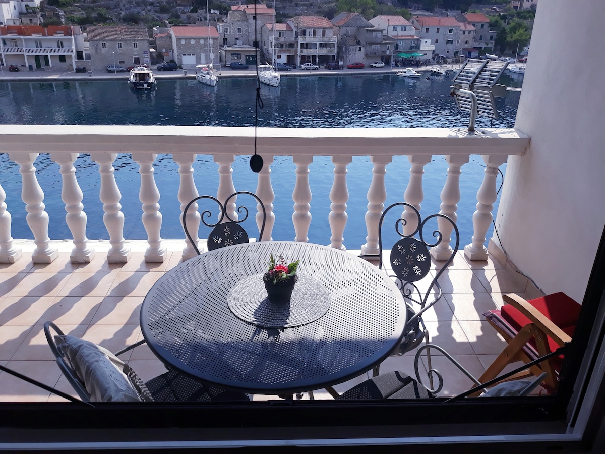 Apartment in Tisno is located short walk from the village center, situated on the second floor of the house, consist of bedroom with double bed, living area with kitchenette and dining table, seaview balcony and bathroom. It is equipped with 1 aircon and wifi. Max is 2 people. Parking is provided for 1 car. From 23:00 ‐ 8:00h is time of night peace, so you are pleased not to disturb other guests. Distance from the festival site is 15-20 minutes walk. No outsiders. No party.