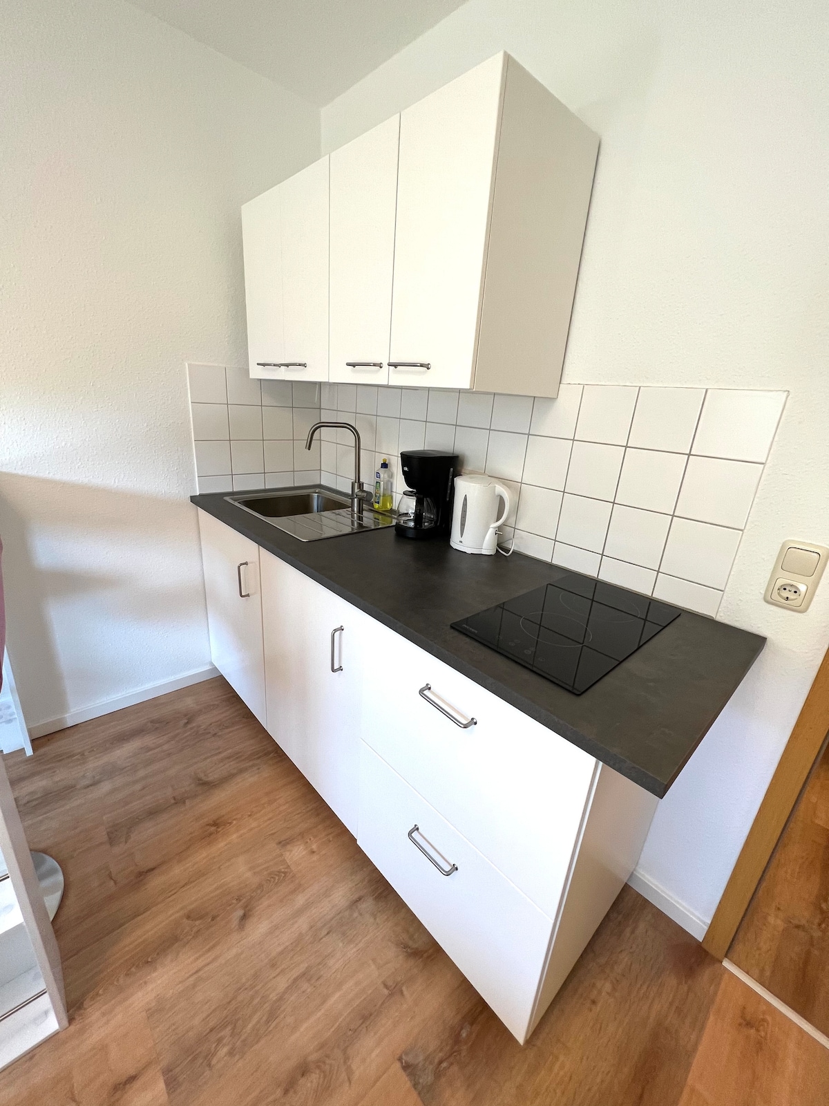 30 sqm apartment in a renovated two-family house Entryway Main room 1.60 m bed, couch (with sleeping function in 1.30 m width), dining table designed as a sideboard Kitchen fully equipped (premium appliances, coffee, tea, drinking chocolate for free) Opposite the double vanity To the left of it is the entrance to the open rain shower To the right of it is the toilet (lockable door) Electric shutters in the main room & toilet Pleated blinds on all windows Vehicle(s) can be parked directly in front of the property (dead end)! Yard not yet renovated